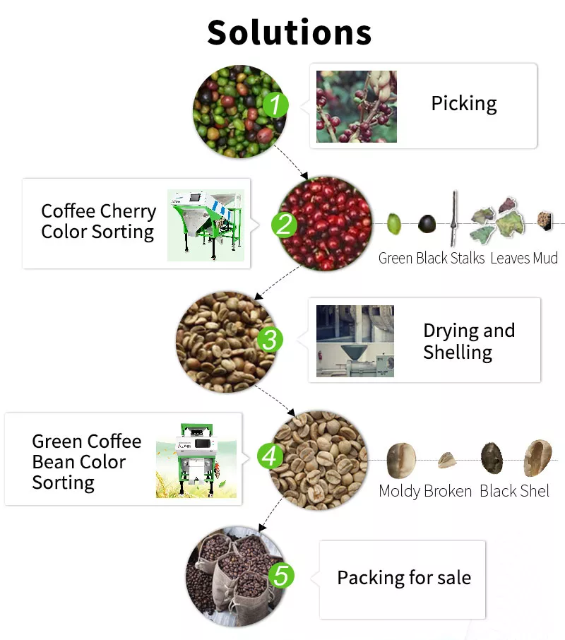 Coffee sorting machine can separate the discolured coffee beans and foreign materials from the good ones.The sorting machine is suitable for robusta coffee bean,arabic coffee bean ,green coffee et .We have built a full range of color sorters for the processing of whole coffee beans.